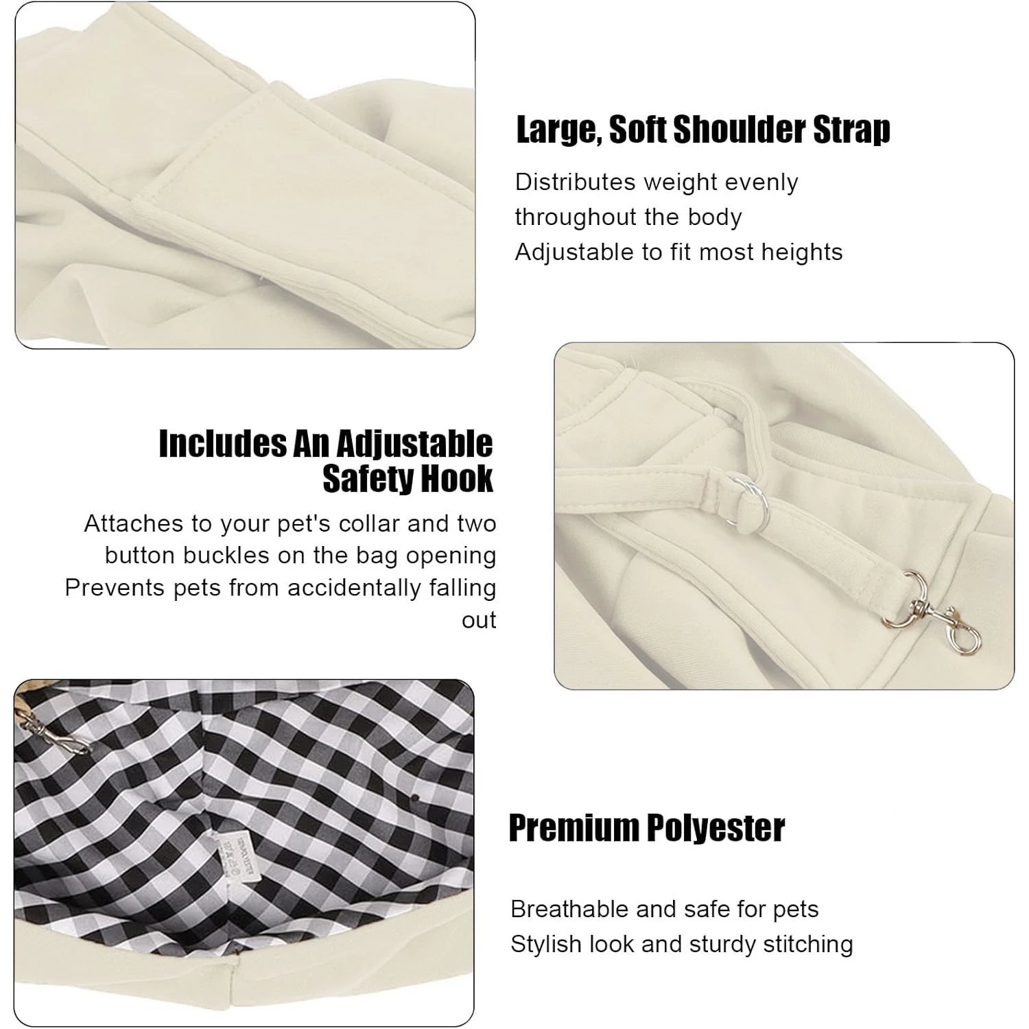 Premium Materials And Design: The puppy carrier is made from selected fabric. The fabric is thick enough to ensure softness and reassure furry children.Hardware and snaps are durable.Our dog carrier has a large opening that can easily put pets in it.You can move the safety belt to change the bag's capacity, and press on the snaps to help close the opening.The sutures are tough, well-made and not prone to cracking.